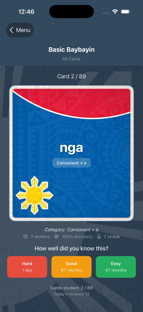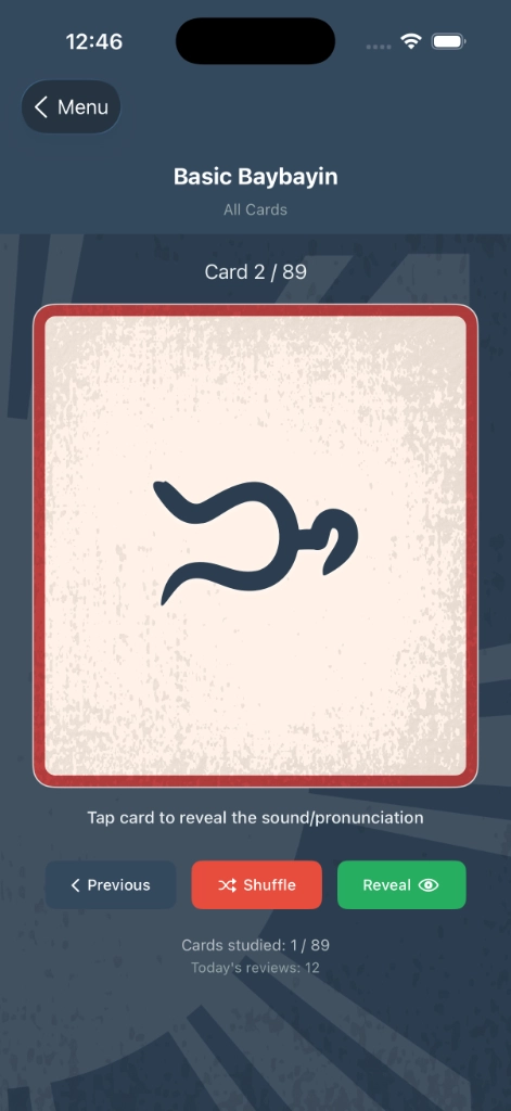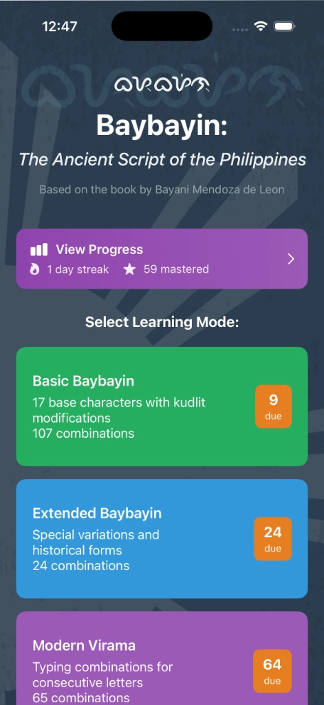 The app is the official digital companion to this book — bringing the Mendoza Baybayin system to life through interactive learning tools that weren’t possible in print.