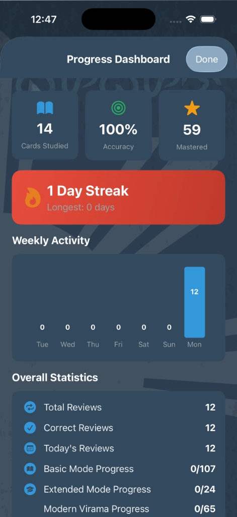 207 cards across four complete character sets. The app tracks your recall and schedules reviews so you remember every character long-term.